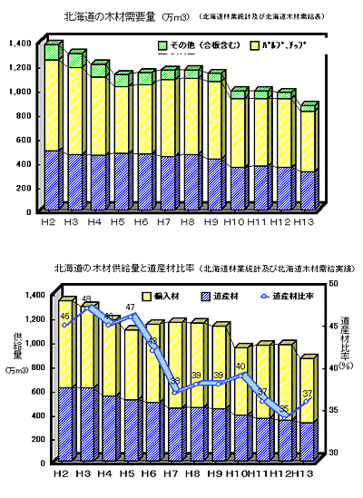 木材は樹木として生長する過程で取り込んだ二酸化炭素を固定し、地球環境にとって大切な役割を担う資源であるばかりでなく、住宅建築の資材や家具の材料などとして私たちの生活にとって欠かすことのできない資源です。 林産試験場では、これまで50数年にわたって、木材を活用した快適な生活や豊かな木の文化をささえる研究、また木材の需要を拡大するための新製品の開発、木材産業の技術力向上のための新技術、新製品の研究開発に取り組んできました。 人々の生活や暮らしの環境は年々向上している一方で、地球温暖化や有害食品などの問題から、健康や生命、環境という分野への意識が高まり、日常生活のなかで安全で高品質な生活資材が求められる時代になっています。 本来、木材は太陽の恵みを受け、自然や環境と調和して生育し、再生可能な人にやさしい資源であり、多くの利用の可能性を秘めた「環境型資源」として、他の資源との違いを誇れるものです。 近年、森林や林業をはじめ木材産業等を取りまく状況は大きく変化し、国では、平成13年に「森林・林業基本法」が制定され、森林の役割が木材生産を主体としたものから「森林の有する多面的機能の発揮」、および「林業の持続的かつ健全な発展」へと転換しました。 また、北海道でも平成14年3月に「北海道森林づくり条例」が制定され、その後、基本理念の実現に向けた「北海道森林づくり基本計画」によって、今後の北海道の森林のすがた、林業・木材産業等の振興方策及びそれらを実現するための数値目標が示されました。 このようなことから、森林を整備する過程で生産されるカラマツ等人工林材の住宅部材への利用や、森林バイオマス等の総合的な利用推進など、木材の需要拡大を図ることは、地域の林業・木材産業等の活性化を図り、森林を健全に維持していく上で大きな役割を果たしています。 林産試験場は、木材産業等を核とした地域の発展に向け、要素技術の研究・開発とその総合化・体系化に積極的に取り組むことが求められています。 これらの情勢の変化に対応し、道民の豊かな生活に貢献し、また本道の木材産業等を今後とも積極的に支援していく役割を担うために、「林産試験場中長期ビジョン」を改訂し、今後の研究、普及方針を示すこととしました。