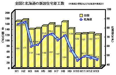 また、道内で生産される木質材料が、建築用材として使用されるためにはJAS、JISなどの規格、建築基準法等の改正に適合するための性能評価や、保守管理技術のマニュアルを整え、木材需要の拡大を図る必要があります。 |