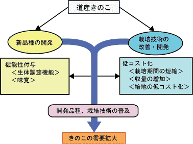 このため、栽培技術の改善、開発によるコスト低減、機能性を付与した新たなきのこの栽培技術の開発を行い、輸入品への対応と、さらなる需要拡大を図る必要があります。 |
