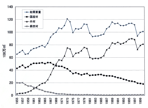 平成13年度の林業白書によれば、12年度のわが国の木材総需要量は1億100万㎥で、しいたけ原木80万㎥と薪炭材94万㎥を除く、用材総需要量9,926万㎥のうち国産材は1,802万㎥で、自給率18.2%となっている。1955(昭和30)年からのわが国の木材需要と供給を図1に示す。この期間の木材需要量の最大は1973(昭和48)年の1億2千万㎥で、これはオイルショックの年である。昭和30年代初期の輸入材は、ほとんどが合板用材のラワンであったが、次第に住宅内装材用にもラワンが使われはじめ、さらに木造住宅の構造材にも輸入針葉樹材が使われるようになって、その輸入量は増加し、1969(昭和44)年には、木材供給における輸入材が国産材の量を上回るようになり、国産材の供給量は次第に減じ、最近では18%という非常に低い自給率である。