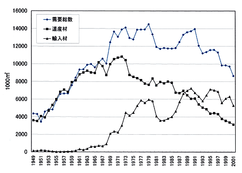 1949(昭和24)年から2001年までの北海道における木材需給の変化(北海道林業統計による)を図2に示す。この期間の需要量の最大は1973年のオイルショックの年で1,412万㎥。全国の最大値と同じ年である。この年の道産材供給量は1,042万㎥で総需要量の73.8%である。輸入材が道産材より多くなったのは1989年で、2001年には総需要量864万㎥、道産材供給量は313万㎥で36.3%に相当する。全国での自給率が18%であるので、北海道では地元材がまだ使われているといえる。