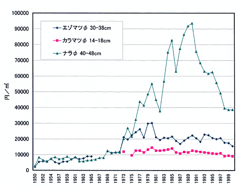 つぎに、北海道林業統計による道材丸太の価格変動を図3に示す。図の数値は直径で、エゾマツは長さ3.65m、3等、カラマツは3.65mで、品等込み、ナラは長さ2.4m、2等の値である。エゾマツ丸太の㎥あたりの価格は北見で1950年に2,160円、翌年には5,400円となり、以後は多少の上がり下がりはあるが、1959年までは7,000〜9,000円で推移し、1969年には12,200円となり、1973年には21,200円、さらにこの期間の最高値は1980年の30,200円(札幌では32,400円)である。2001年には15,600〜16,800円という値である。私事であるが、1951年に北海道林務部に就職したときの月給は、このときのエゾマツ3等丸太1㎥の値5,400円とほぼ同じであった。現在、給料は30倍以上になったが、エゾマツ丸太の価格は3倍に過ぎない。これでは50年前に成り立った林業は、人件費に押しつぶされてやっていけない。 カラマツの価格は1973年から記載されており、9,600〜13,000円/㎥で推移し、この期間の最高値は1985年の14,040円(北見)である。最近は価格が下がり、2001年には9,100〜9,300円である。 ナラは北海道の広葉樹の王様といわれ、インチ材として欧米各国に輸出されてきた。特に戦後の食糧難のときには、カバ、セン、シナなどの広葉樹合板とともにわが国の貴重な輸出資源として外貨をかせぎ、食糧を輸入し、飢えをしのぐことができたのである。このナラの丸太は直径がエゾマツより大きいのに、1972年までエゾマツと価格にあまり差がなく経過していた。しかし、1973年からナラの価格が上がりだし、1990年には最高値の93,600円となった。その後急激に下がり、1998年に39,600円となり、以後同程度の価格となっている。北海道の天然林のナラ(ミズナラ)は、一般に生長が悪く、年輪幅が1mm前後から2mmまでのものが多く、このためナラ類としては材が軟らかく、家具・建具への加工が楽であった。北米のホワイト・オークは非常に硬く、酒類の樽には適するが、乾燥が非常にむずかしく、家具・建具、内装用には道材が好まれた。この貴重な資源もわずかな期間に伐りつくされ、外国のナラを輸入する時代になってしまった。