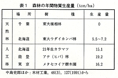 表1は日本の森林の年間物質生産量を表したものです。表から明らかなように,天然林の生産量はあまり増えていませんが,人工林はどんどん増加しています。木は空気中の炭酸ガスを吸収して成長しますので,植林を進めて人工林の成長を図ることは,地球環境を守ることにつながるわけです。 しかし,人工林を豊かな森林に育てるためには,手入れが必要です。雑草を刈り取ったり,幹にからまるつるを切ったり,除伐や枝打ちなどを行わなければなりません。そのためにはお金がかかります。もし,その手入れにかかる費用を補償できる価格で,原木を購入しないならば,林業家が経営意欲を失って手入れがおざなりになり,林が荒廃して,地球環境を守る豊かな森林が育ちません。 そのためにも,木材は単に市場原理だけで取り引きするのではなく,環境原理ともいえる価格体系を作って取り引きすることが必要でしょう。 また,最近円高や海外の安い人件費を背景に,安価な木材,木製品が入って来るようになりました。消費者という立場だけでみると,これは歓迎されることでしょう。確かに,今のうちは安い外材を使い,国内の森林を温存すれば良いという意見にも出会います。しかし,これが間伐等国内の人工林の手入れを妨げ,森林の荒廃につながっているとすれば,やはり問題でしょう。なぜなら,人工林が荒廃しても,海外から山まで輸入することはできないからです。そのためにも,環境原理ともいうべき視点からみた適切な輸入体系を考えることも必要だと思いま