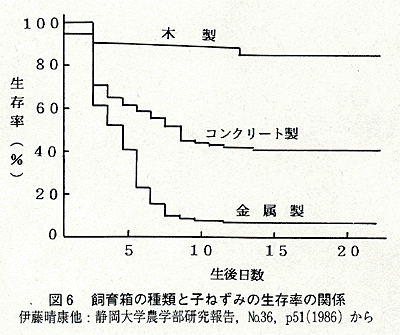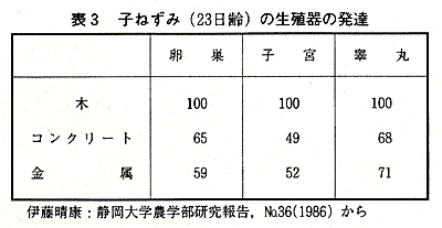 種類の異なる飼育箱で,生まれたばかりの子ねずみを飼育する実験が行われました。その結果は図6に示すように,コンクリートの飼育箱では1週間後に50%,金属では90%が死にましたが,木の箱での死亡率は10%程度に留まっています。 飼育箱の種類は,子ねずみの繁殖機能の成長にも大きな影響を及ぼすことも発表されています。表3からわかるように,卵巣,子宮,睾丸の成長量は,木の飼育箱での成長量を100とすると,コンクリートや金属では50〜70程度に留まり,木が動物の繁殖機能の成長にとってもすぐれていることが明らかになりました。