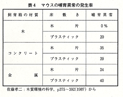 また,ねずみの夫婦を飼育箱で飼い,生まれた子供の哺育の様子を調べる実験も行われました。その結果は表4に示すとおり,親が子どもをきちんと育て,世代が正常に継続していったのは,木の箱に木屑を敷いたときのみで,コンクリートやアルミの飼育箱では,親が子ねずみをかみ殺すなど,何らかの哺育異常が発生しました。