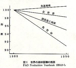 図1は世界の森林面積が,1980年を100としたとき,1990年にはどう変化したかを表したものです。図から明らかなように先進地域の森林面積は増えています。それは木を伐採した後には,必ず植林をしているからです。しかし,地球の肺,野生生物の宝庫といわれる熱帯林や開発途上地域の森林は急速に減少しています。