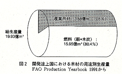 図2は熱帯林を含む開発途上国における木材の用途別生産量を表したものです。紙や建築材料,家具材料などの用材として使われているのは全体の20%,残りの80%は薪や炭などの燃料として使われていることがわかります。そして,世界に輸出される量は用材の20%,全体のわずか4%に過ぎません。したがって,仮に先進地域で熱帯材を一本も使わないとしても,この地域の燃料問題や食糧問題を解決することなしには,熱帯林の減少を食い止めることはできません。