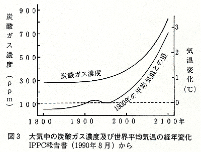 図3は大気中の炭酸ガス濃度と地球の平均気温の経年変化を示したものです。図から明らかなように,産業革命後,石炭や石油を大量に使うことによって,それまで0.3%と変わらなかった炭酸ガス濃度が増加し,それに伴って地球の平均気温も上がり続けていることがわかります。このままの勢いで炭酸ガスが増え続けると,21世紀末には平均気温が3℃上昇し,南極や北極の氷が融けて海面が1m近く上昇し,例えばナイル川河口だけでも530万人もの人達が土地を失うなど,人間生活に重大な影響を及ぼすと警告が発せられています。