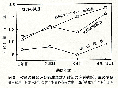 図8に教師の蓄積的疲労すなわち気力の減退について調査した結果を示しました。その結果,大人の場合も子どもの場合と同様に,木造校舎の方が鉄筋コンクリート造に比べて疲労の少ないことがわかります。そして,勤務年数が長くなるにつれて,木造の場合は変わりませんが,鉄筋コンクリート造では,明らかに疲労がたまって行くことがわかります。このように,木材は子どもの教育環境としても,教師の勤務環境としても勝れていることがわかりました。