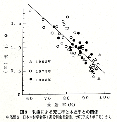 図9に西日本地域の女性を対象に,木造率と乳癌による死亡率の関係を調査した結果を示します。1968年から10年毎に調査したものですが,木造率が高いほど乳癌による死亡率も減っています。そのほか,肺癌,食道癌,肺臓癌についても,乳癌と同様に木造率が高いほど死亡率が減少することがわかっています。