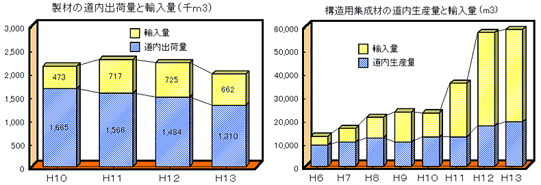製材、構造用集成材など製品で輸入される木質材料が増加しています。今後はこれら輸入製品に対抗できる製品の開発が必要です。 |